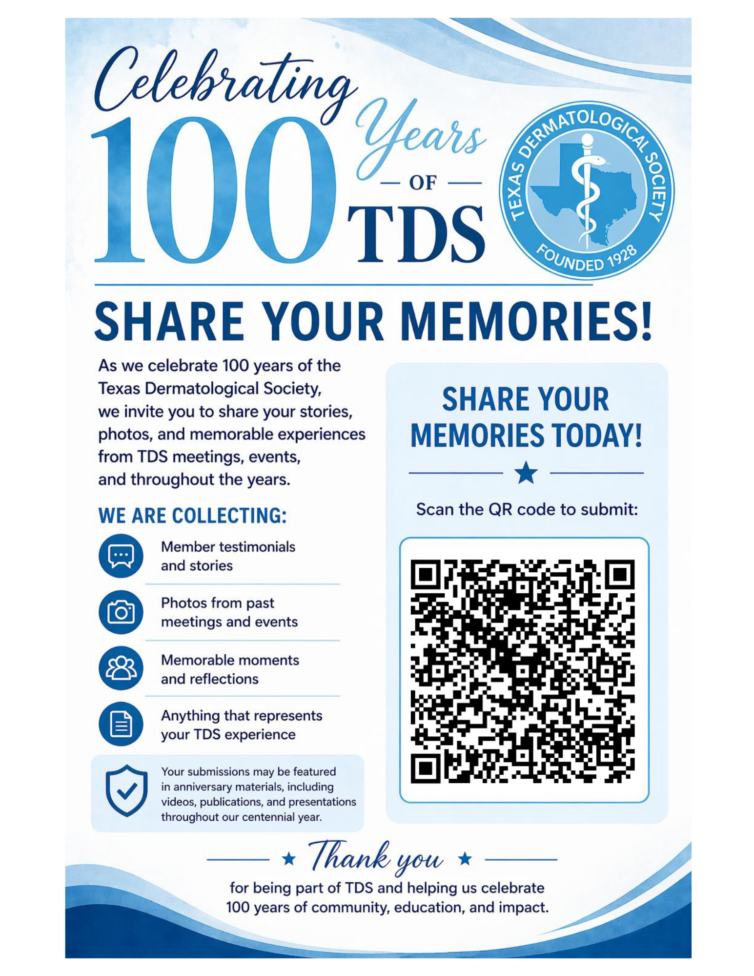 Welcome to the Texas Dermatological Society!The Texas Dermatological Society (TDS) was formed more than ninety years ago to promote and advance the science and art of medicine pertaining to diseases of the skin. The TDS currently has close to 1000 member physicians from the state of Texas! If you are not a current member of the TDS, please join today, we’d love to have you!The purposes of the Texas Dermatological Society are scientific and educational: