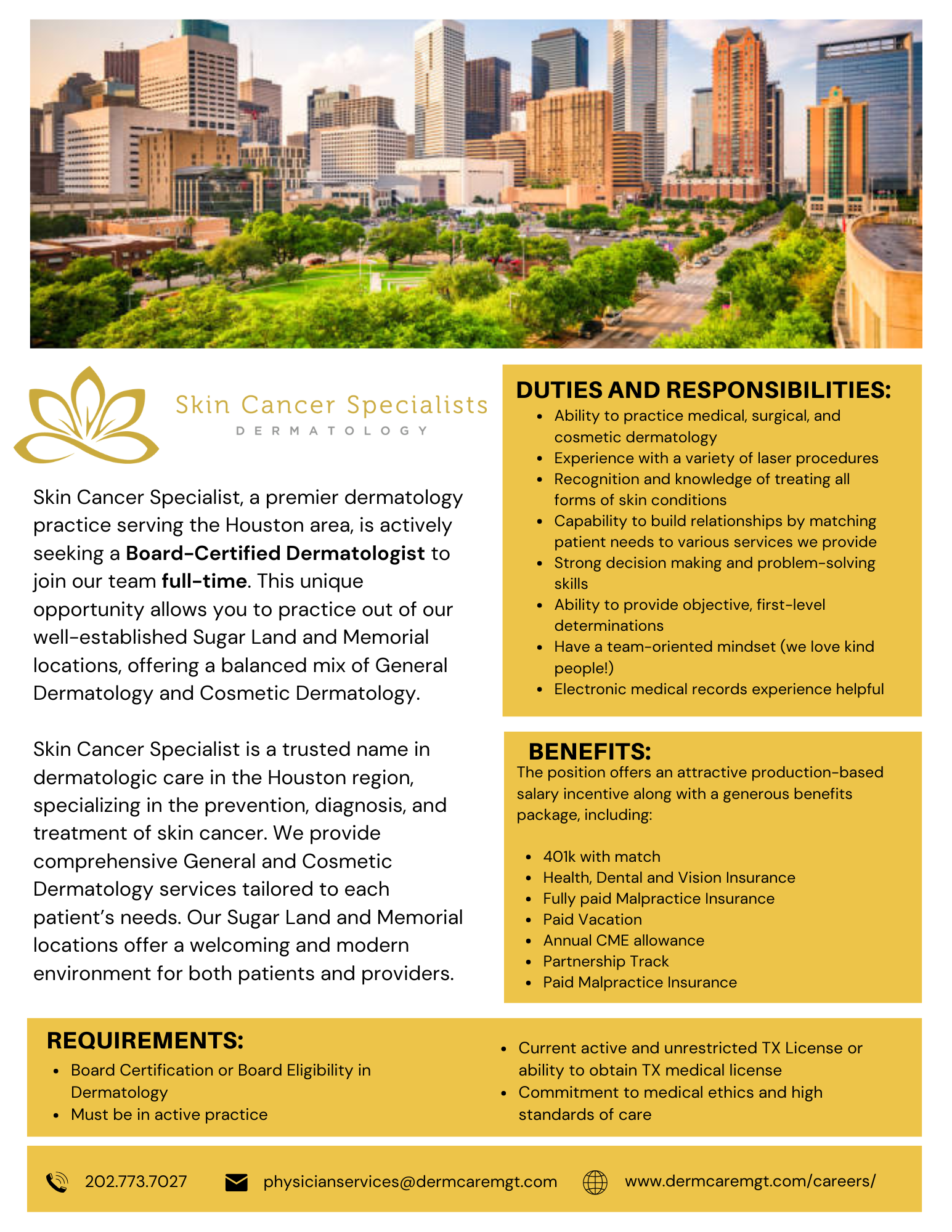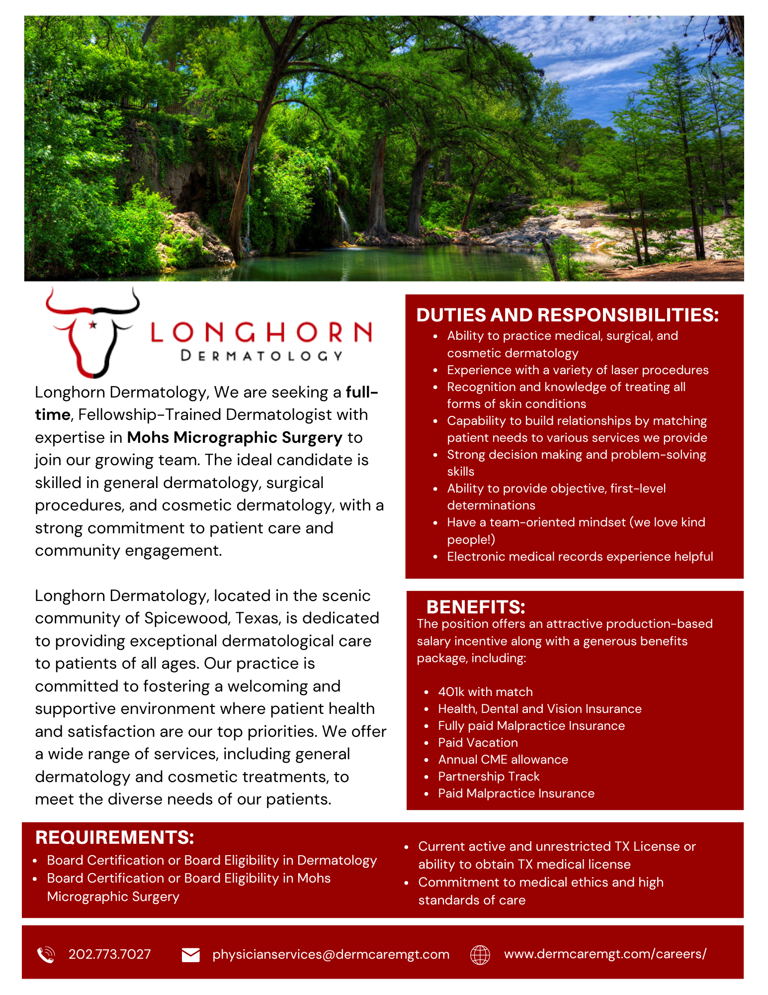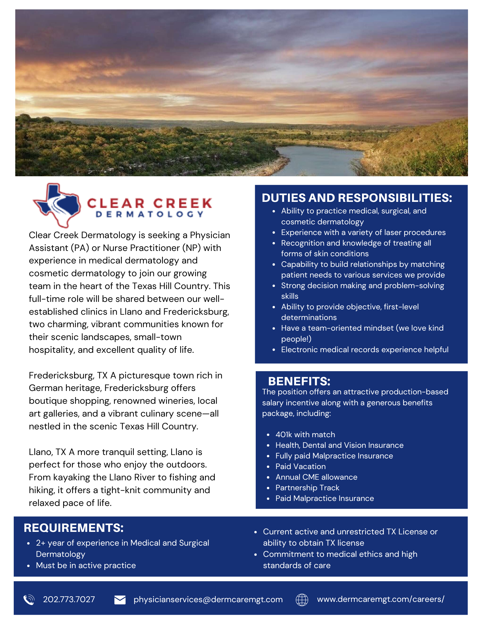 Practice OpportunitiesPlease email [email protected] if you are interested in posting a seeking position opportunity. There is no charge to post a job ad on this board. The ad will stay up for 3 months then removed.Clear Creek Dermatology - Llano, TX Longhorn Dermatology - Spicewood, TX Skin Cancer Specialist - Houston, TX Northstar Dermatology - Dermatologists Needed - DFW Area Dermatology Products for Sale - San Antonio, TX Full-Time BC/BE Dermatologist - New Braunfels, TX Revelus Dermatology - Full-Time Dermatologist - Austin, TX Texas Dermatology - Dermatologist - San Antonio, TX